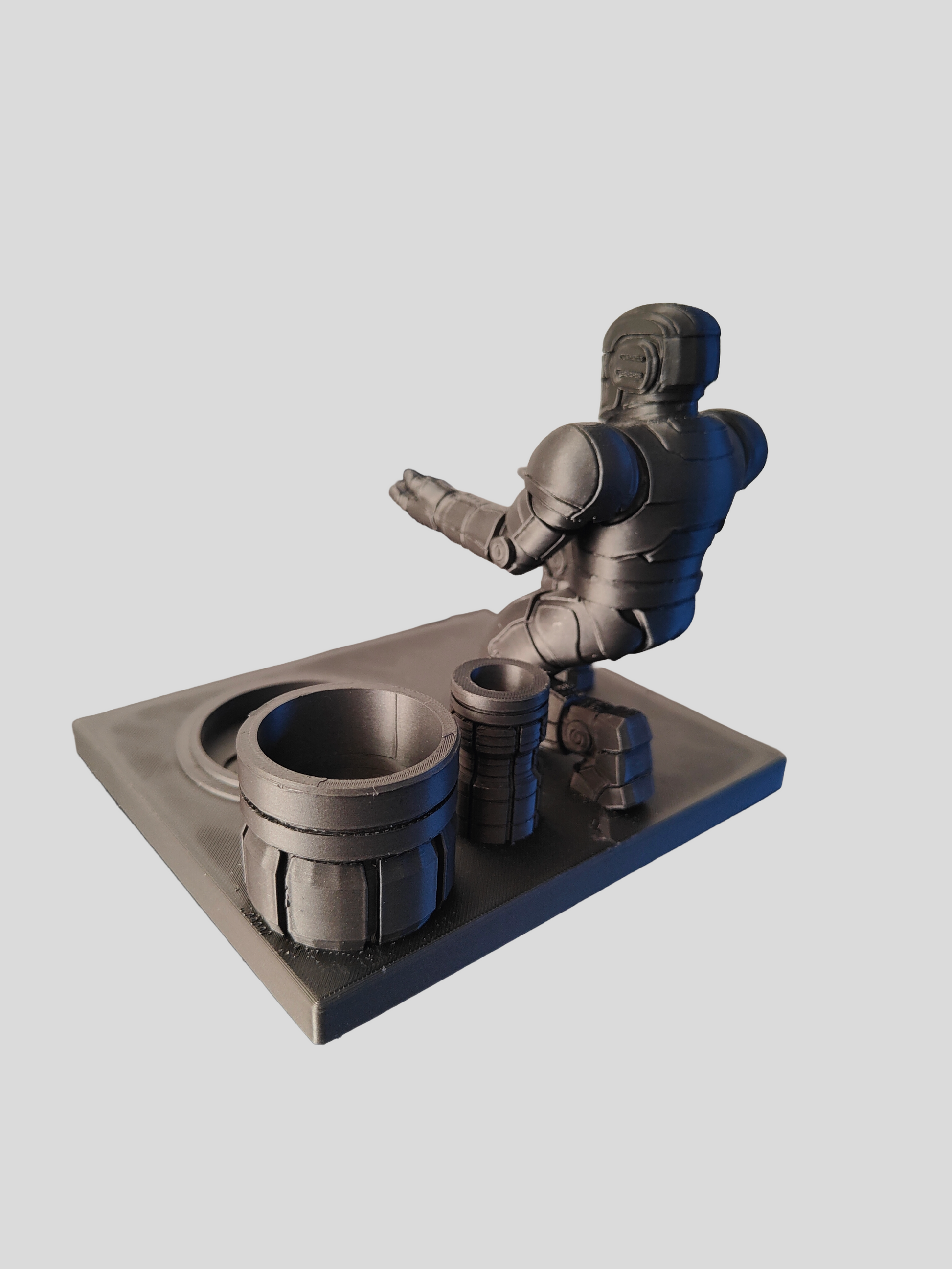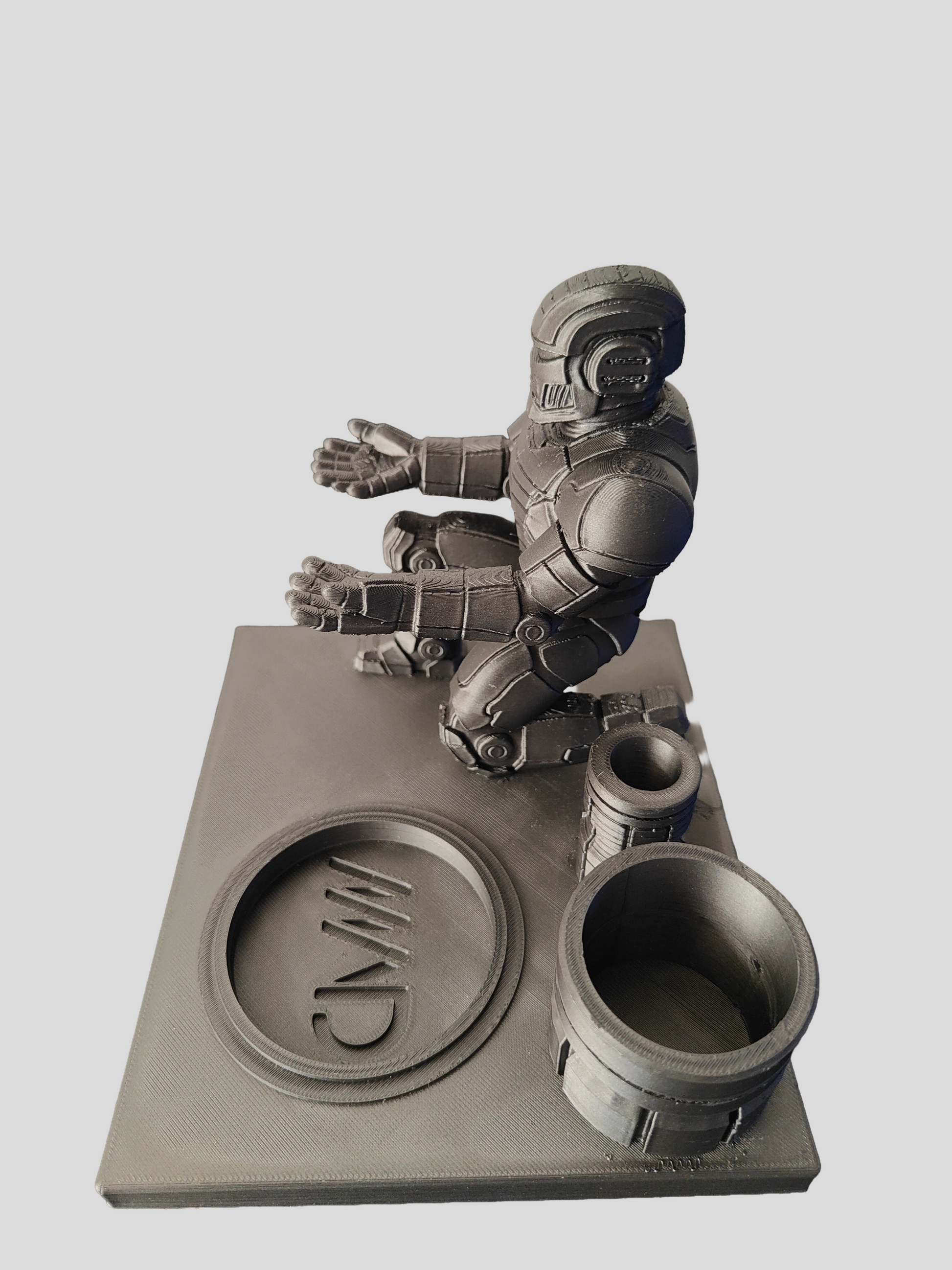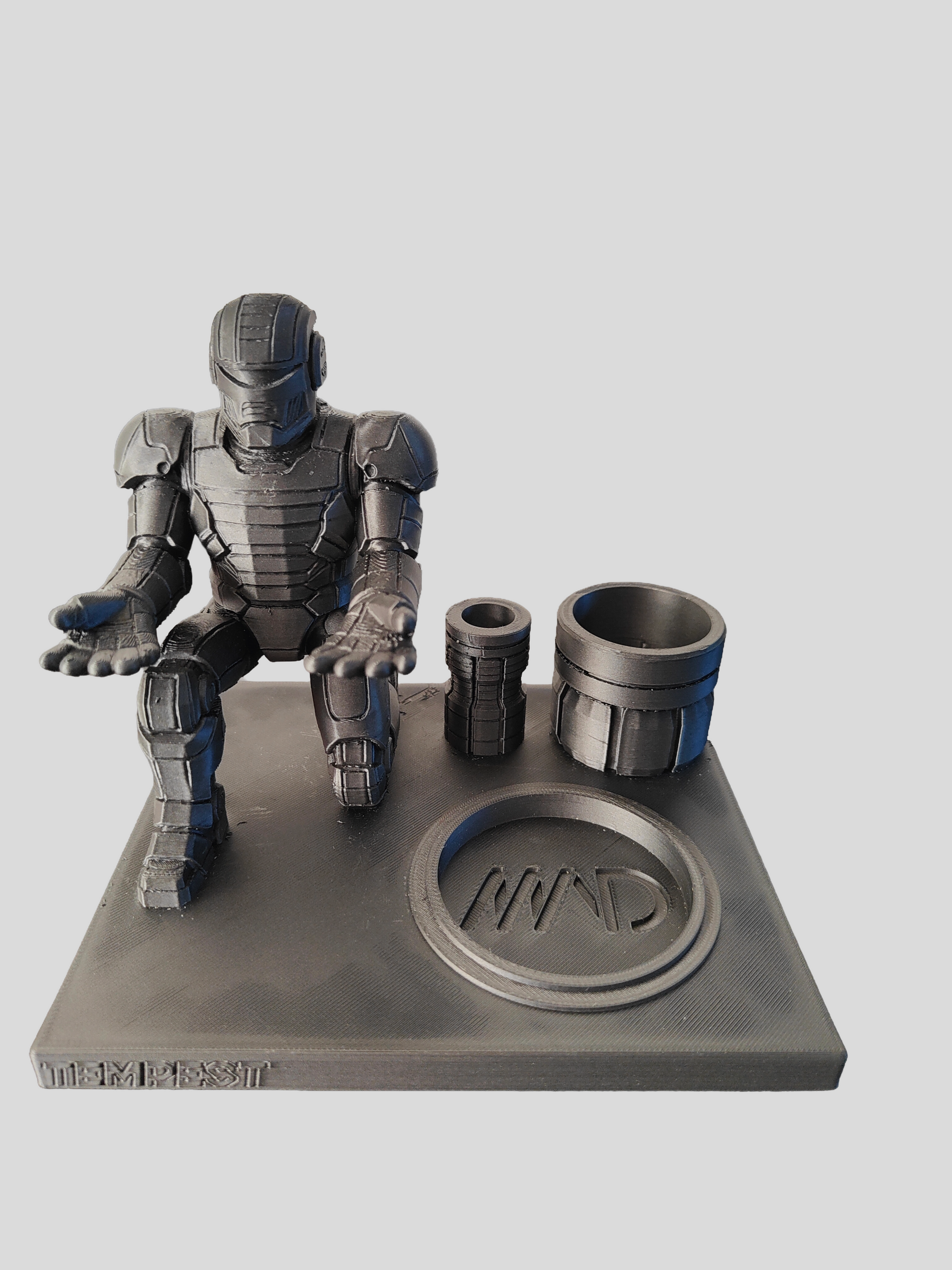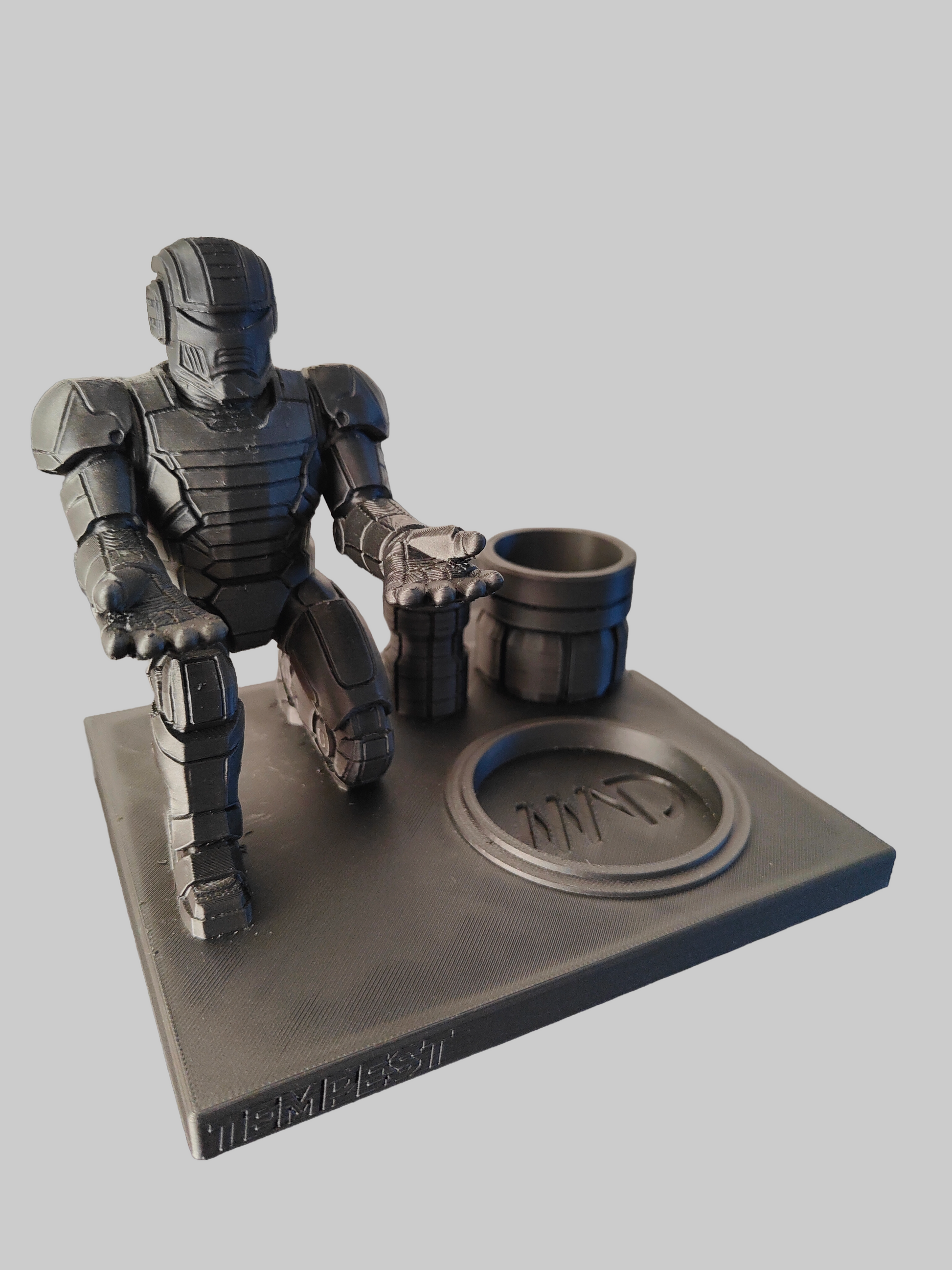 Every stand features a kneeling armored mech with open, cupped hands ready to hold your Tempest 2, accessories, or tools — making it both functional and collectible.